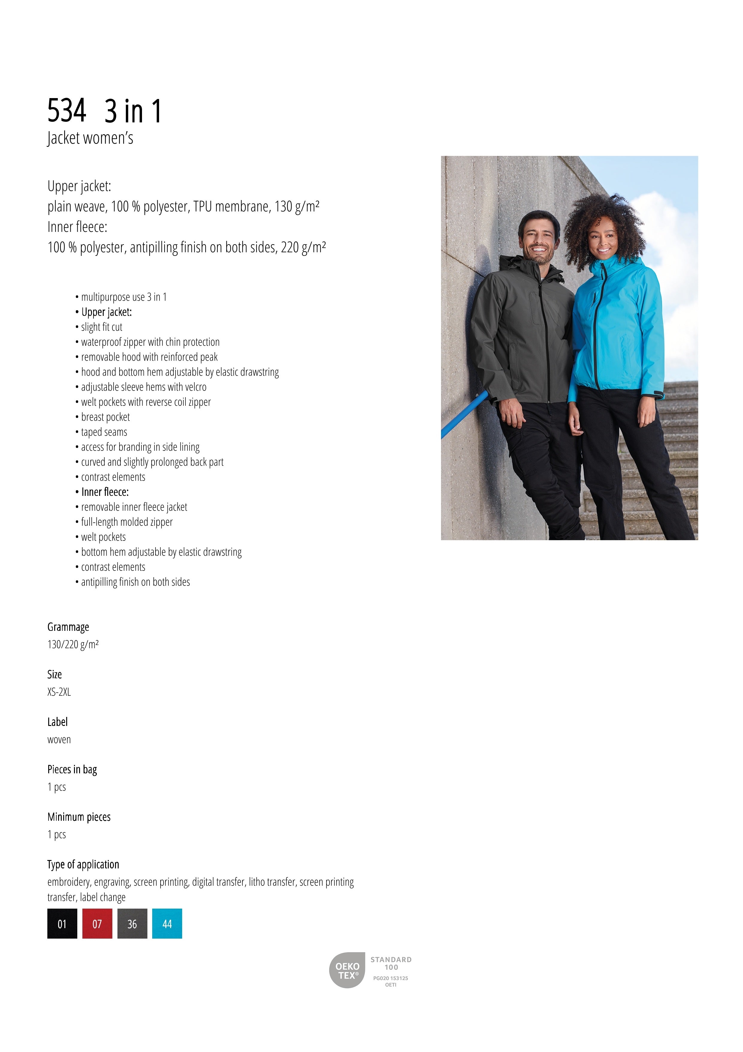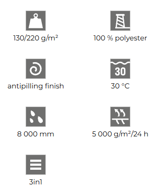 - waterproof 8 000 mm, breathable 5 000 g/m²/24 h.