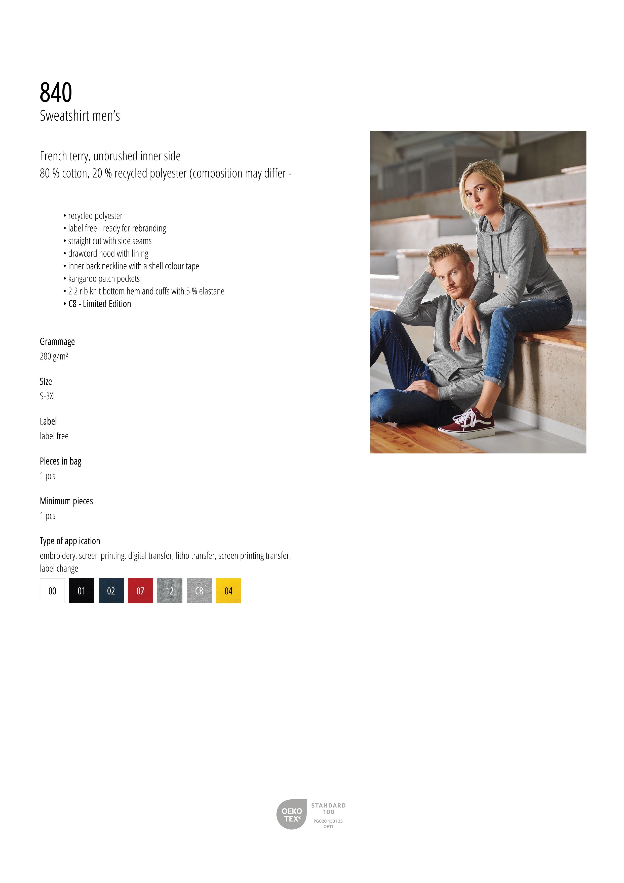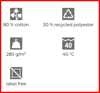 • 80 % cotton, 20 % recycled polyester (composition may differ - colour 12 – 70 % cotton, 30 % recycled polyester)