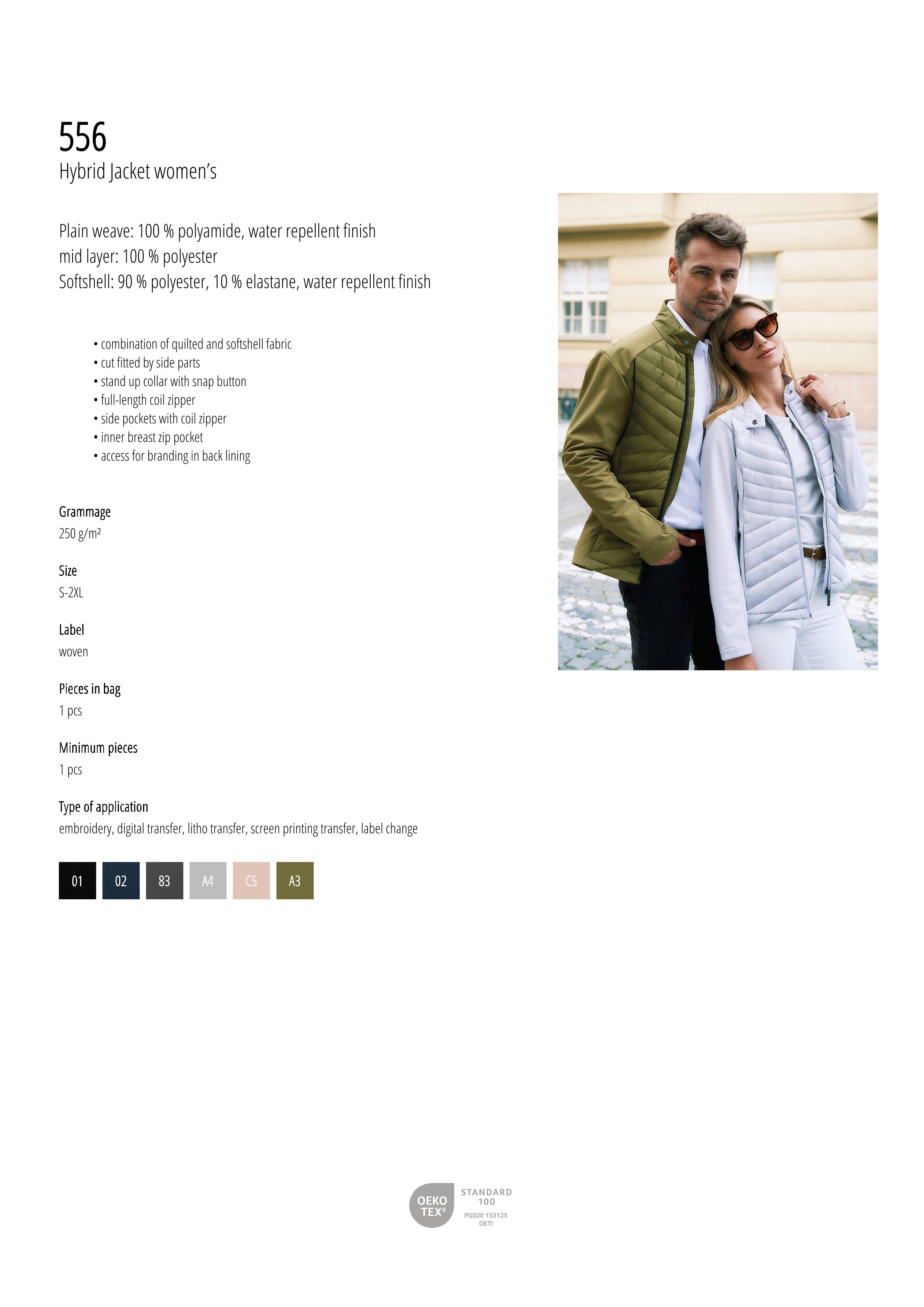 - Softshell: 90 % polyester, 10 % elastane, water repellent finish